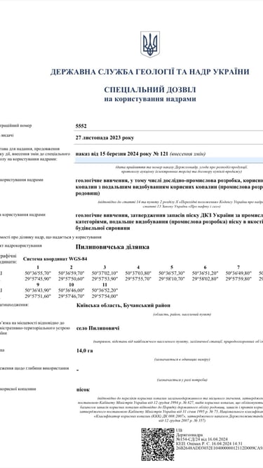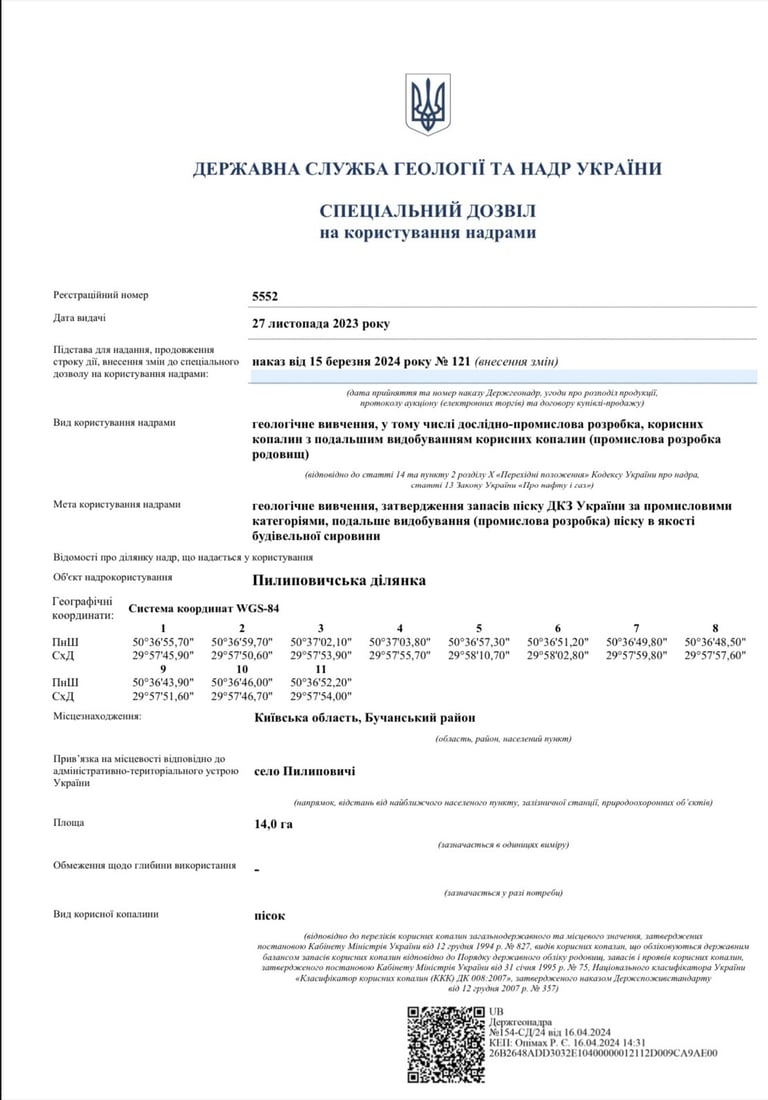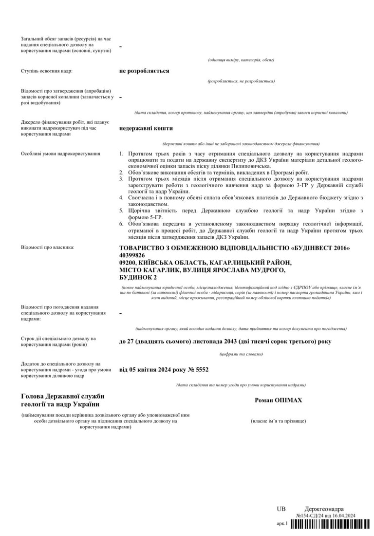 Наша компанія, ТОВ «Будінвест 2016», отримала спеціальний дозвіл на користування надрами від Державної служби геології та надр України. Цей документ дозволяє провести геологічне дослідження, а також видобування піску на Пилиповицькій ділянці, що розташована в Київській області, Бучанському районі, селі Пилиповичі.
